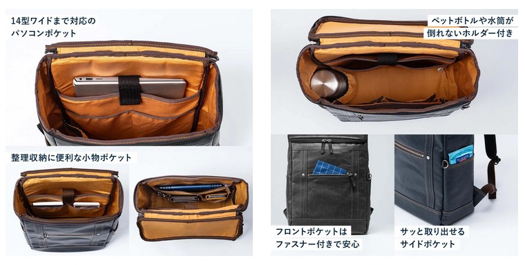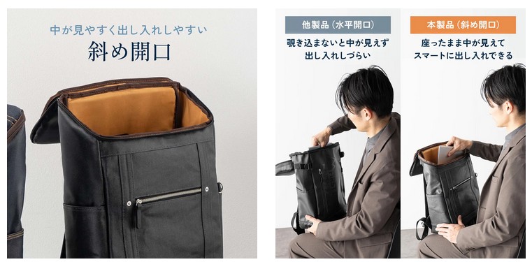 メイン収納は斜めに大きく開く設計を採用しており、バッグの中身をひと目で確認しやすいのが特長だ。さらに、内装には明るいオレンジ色を採用しているため、小物が埋もれにくく、必要なものを見つけやすくなっている。忙しい移動中や会議前でも、スマートに荷物を取り出せる使い勝手のよさが光る。