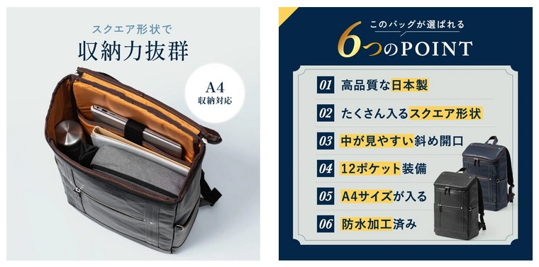 約23リットルの収納力を備えたボックス型のスクエア形状で、A4ファイルや14型ノートPCをしっかり収納できる。荷物が多くなりがちなビジネスシーンはもちろん、通学や外出時にも頼れるサイズ感だ。しっかり入るのに見た目はすっきりとしており、スマートに持ち歩けるバランスのよさも大きな魅力だ。