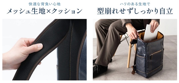 岡山産の児島デニムを使用し、鞄づくりの名産地として知られる兵庫県豊岡で縫製した、日本製ならではの魅力が詰まったビジネスリュック。素材の風合いと丁寧な仕立てが調和し、日常使いのアイテムでありながら、持つ人のこだわりや品格まで引き立てる。通勤バッグに“質のよさ”を求める方にふさわしいモデルだ。
