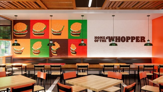 店舗デザインのブランドカラーには、本格的なバーガーのおいしさを感じて、バーガーキング自慢の直火焼きの100%ビーフパティやセサミバンズ、フレッシュなレタス、トマト、オニオンの新鮮な野菜、マヨソース、ケチャップなどをモチーフにした、レッド・オレンジ・ブラウン・グリーン・イエローなどの色を使用している。