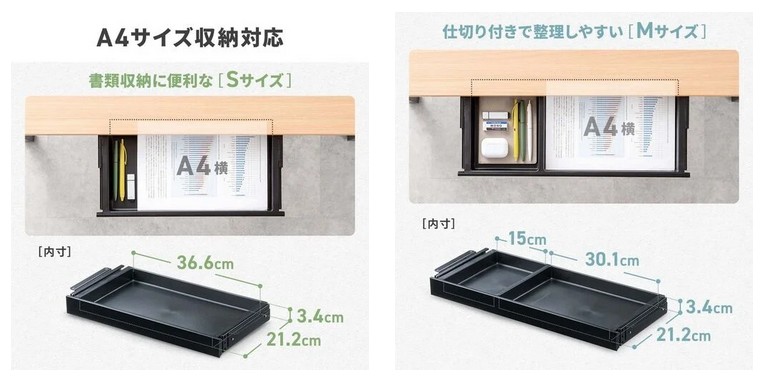 ■デスク下に簡単に後付けでき、A4書類や小物をすっきり収納できる「デスク下収納ボックス 引き出し「100-KB025BK(Sサイズ)」