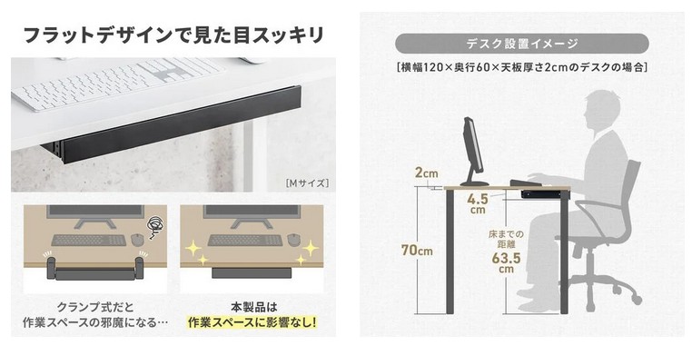 本製品は、デスク下にすっきり収まるフラットデザインを採用し、従来のクランプ式収納のように作業スペースを邪魔しない。引き出し部分が出っ張らないため、足元や手元の動きを妨げず、快適なデスク環境を維持できる。見た目もシンプルで洗練されており、オフィスや在宅ワーク空間に自然に溶け込む。