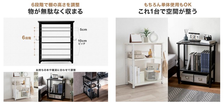 中棚は6段階で高さ調整ができる。書籍や雑誌、収納ボックス、ガジェット、周辺機器など、置きたい物のサイズに合わせて棚位置を変えられる。固定された棚では収まりにくい物もすっきり収納できるため、デスク周りの整理整頓がしやすくなる。見せる収納としても使いやすく、リビングや寝室にも設置できる。自由度の高いオープンラックだ。