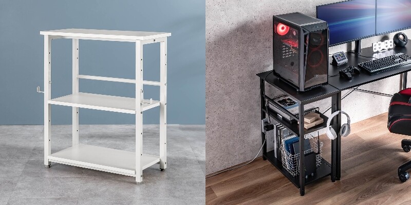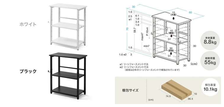 底板には補強パイプを追加し、耐荷重30kgを確保している。重量のあるゲーミングPCや大型機器を足元に置きたい場合にも安心。天板は15kg、棚板は10kgまで対応し、総耐荷重は55kg。パソコン周辺機器をまとめて収納したい方や、デスク下・デスク横を有効活用したい方に頼れる一台だ。
