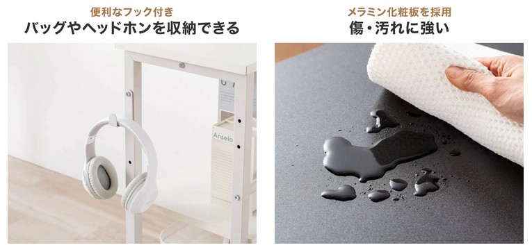 本製品には、バッグやヘッドホンを掛けられる便利なフックが付属している。デスク周りに置き場所がなく散らかりがちな小物も、サッと掛けるだけですっきり収納できる。さらに天板には、傷や汚れに強いメラミン化粧板を採用。飲み物をこぼしてしまった時も拭き取りやすく、日常使いにぴったり。収納力だけでなく、使いやすさにもこだわったオープンラックだ。