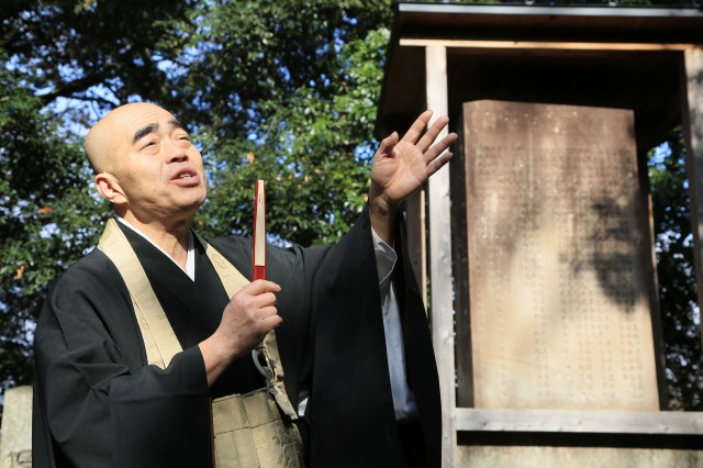 西郷隆盛と月照上人について語る同寺の前住職・杉井玄慎さん |