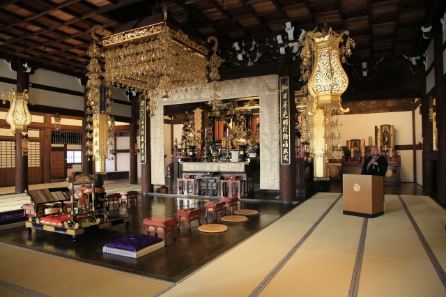本堂では島津家ゆかりの火鉢や重箱のほか、徳川十五代将軍慶喜筆の掛け軸などの寺宝を特別展示していた。境内には、西郷隆盛が自筆した「東征戦亡の碑」が建つ。また鎌倉時代の公家であった関白藤原兼実の山荘「月輪殿」跡である庭園も見学できた。