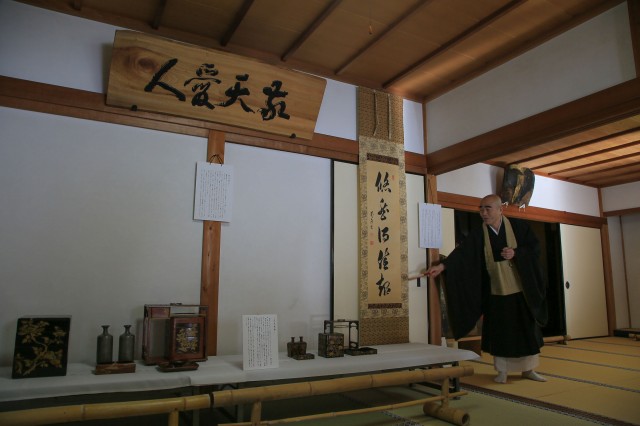 徳川十五代将軍慶喜筆の掛け軸などの寺宝の特別展示。 |