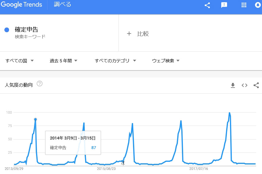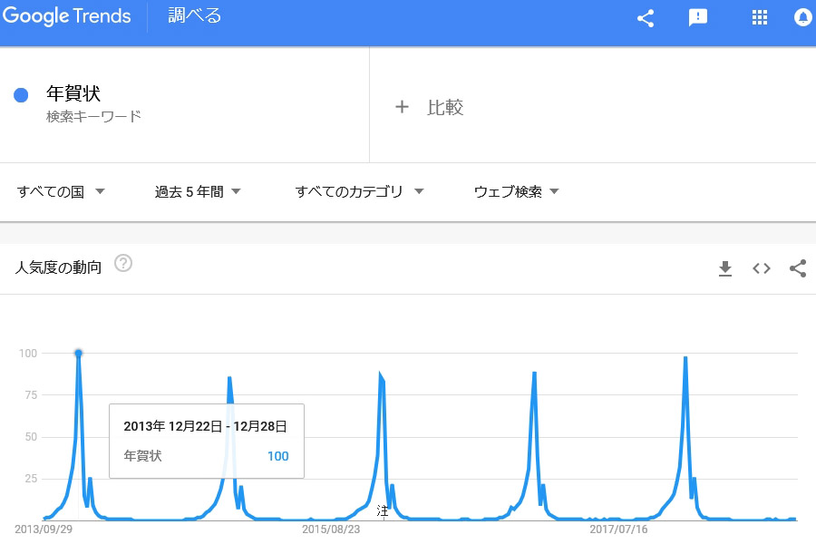同じように「年賀状」を調べると年末がピーク、「確定申告」を調べると3月がピークとなっており、それぞれにとって旬な時期になると人々の関心が集まることが見て取れる。