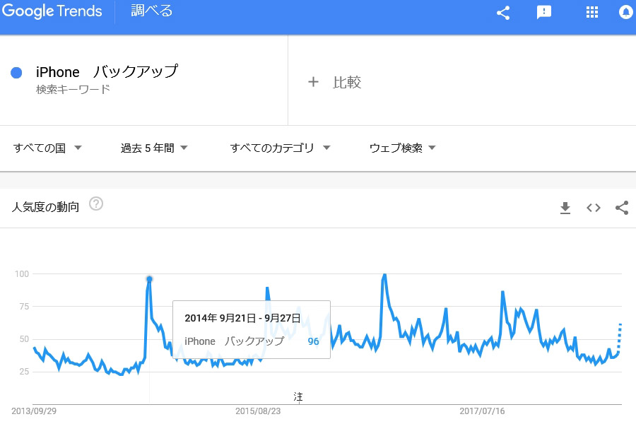 9月から10月にかけ、日本ではiPhoneのバックアップ方法に関心が集まる時期だ。例えばGoogle Trendsで「iPhone」「バックアップ」をキーワードに調べた結果を見ると、毎年9月下旬になるとネットでiPhoneのバックアップについて検索をする人が増えていることがわかる。