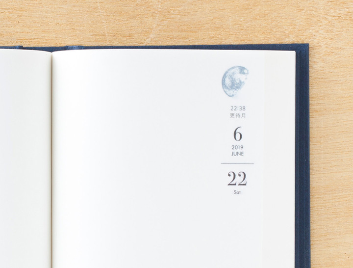 毎日のページには、日付と曜日のほかに、月についての情報を掲載している。その日、月が顔を出す時刻、月の呼び名、そして月のカタチを目にすることで、ページをめくるたびに、満ちては欠けていく月の変化が感じられるデザインになっている。そうした日付と月の情報を除いては、罫線のない無地のデザインとなっており、日記やスケジュールなどを自由に書き込んでいただくことができる。