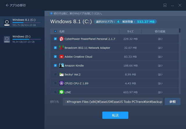 こちらも手順は簡単。「アプリの移行」を選んだら、次の画面で移行させたいアプリを選び、「転送」をクリックするだけだ。なお転送したいファイルは、ファイル名や容量でソートできるので、容量を大きく取っているアプリを選ぶことも簡単にできる。
