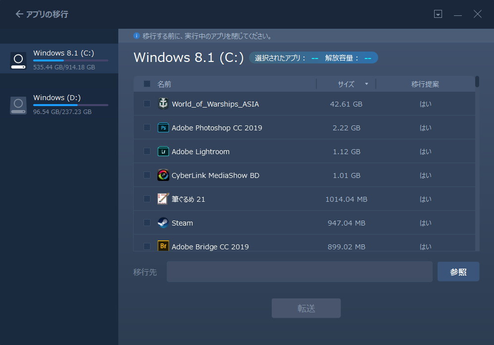 「アプリの移行」では、現在使っているドライブにインストールされているアプリを、ほかのドライブへ移行してくれる。メインにSSD、サブに大容量HDDを利用している人もいるだろう。SSDの容量が限られている場合はすぐにアプリでいっぱいになってしまうので、あまり使う頻度が高くないアプリを、大容量HDDに移行させるのも一つの手だろう。