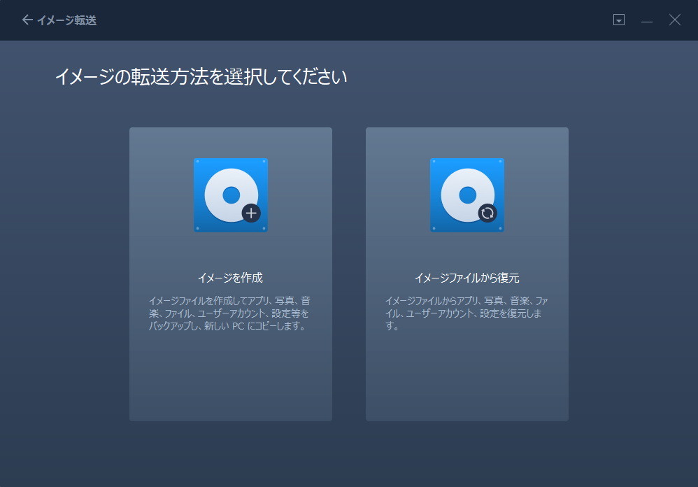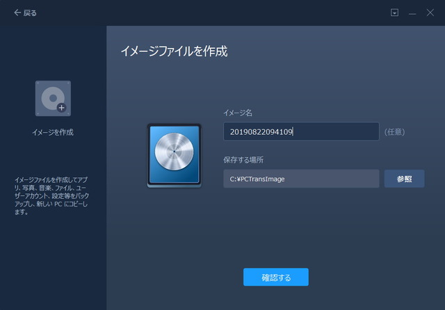 こちらも手順は簡単で、「イメージ転送」の項目を選び「スタート」をクリック。イメージを作成するか、復元するかを選ぶ画面が表示されるので、作成か復元かを選択すればよい。そのあとは、イメージを作成するなら保存場所を決め、アプリやファイルなど、イメージを作成したい項目を選び「作成」をクリックすれば完了だ。あとは自動的にPCTransが作業してくれる。復元の場合は、イメージが保存されている場所をPCTransが探してくれるので、それを選んで復元すればOKだ。