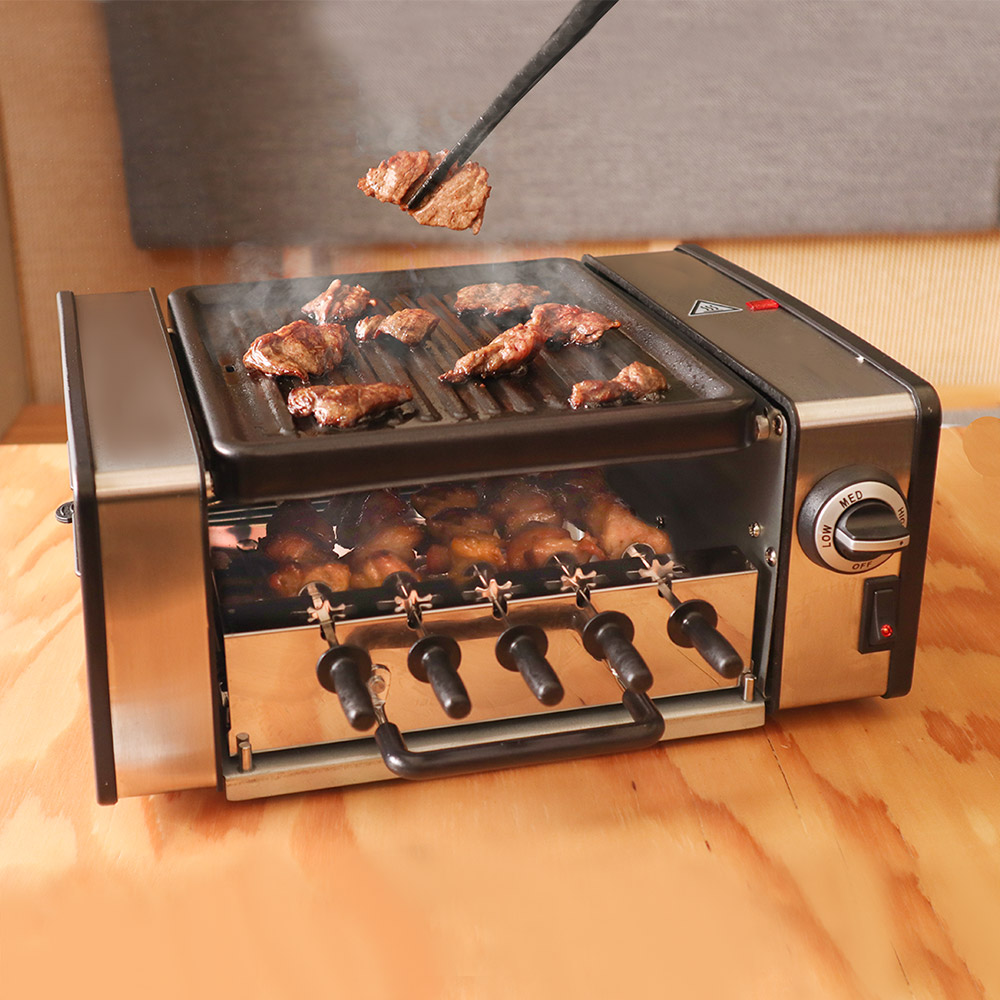 高さ145×幅322×奥行き215mmで卓上に置けるコンパクトサイズ。本体の真ん中部にヒーターがあり、ヒーターの上にプレートをのせて焼肉が楽しめる。ヒーターの下部分には付属の串を5本までセットでき、回転スイッチをオンにすれば串を自動で回転しながらムラなくおいしいふっくらしとした焼き鳥や串焼を楽しむことが可能。さらに付属のローラーをセットすれば、ローラーの上にフランクフルトなどもおいしく焼くことができる。