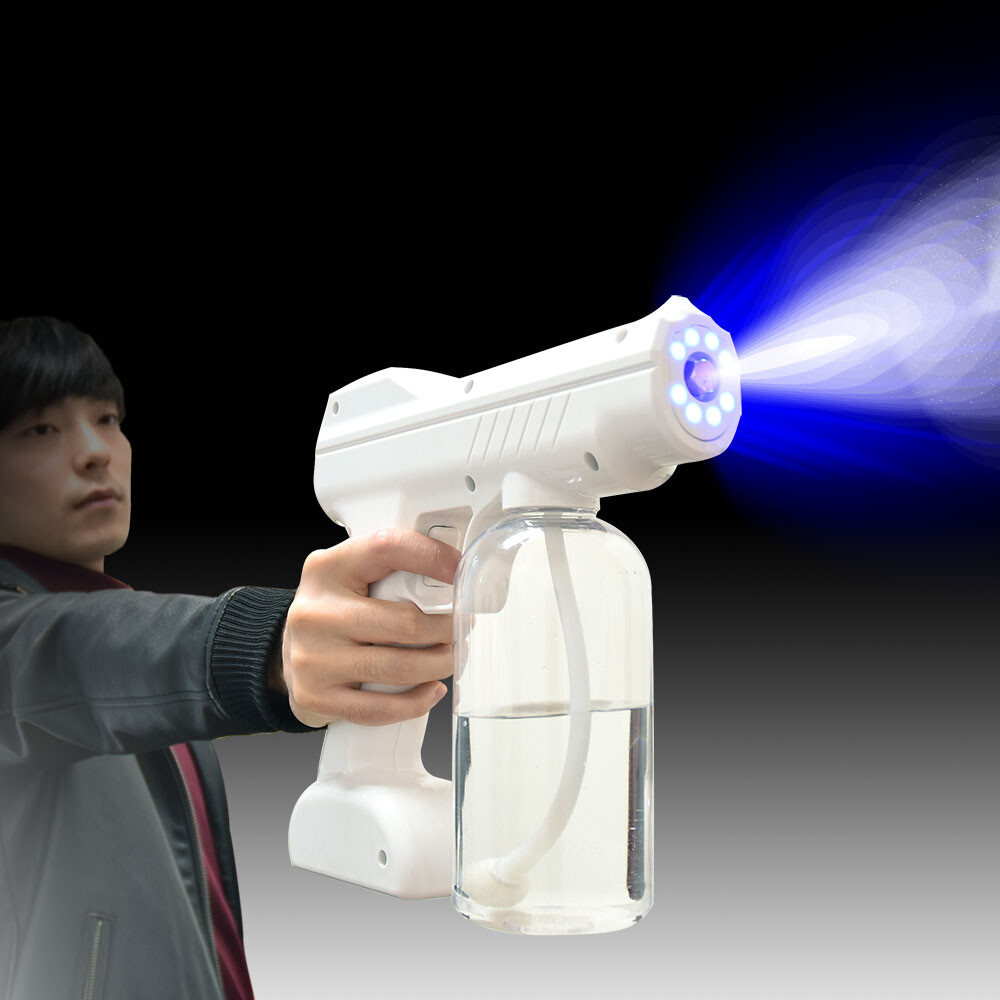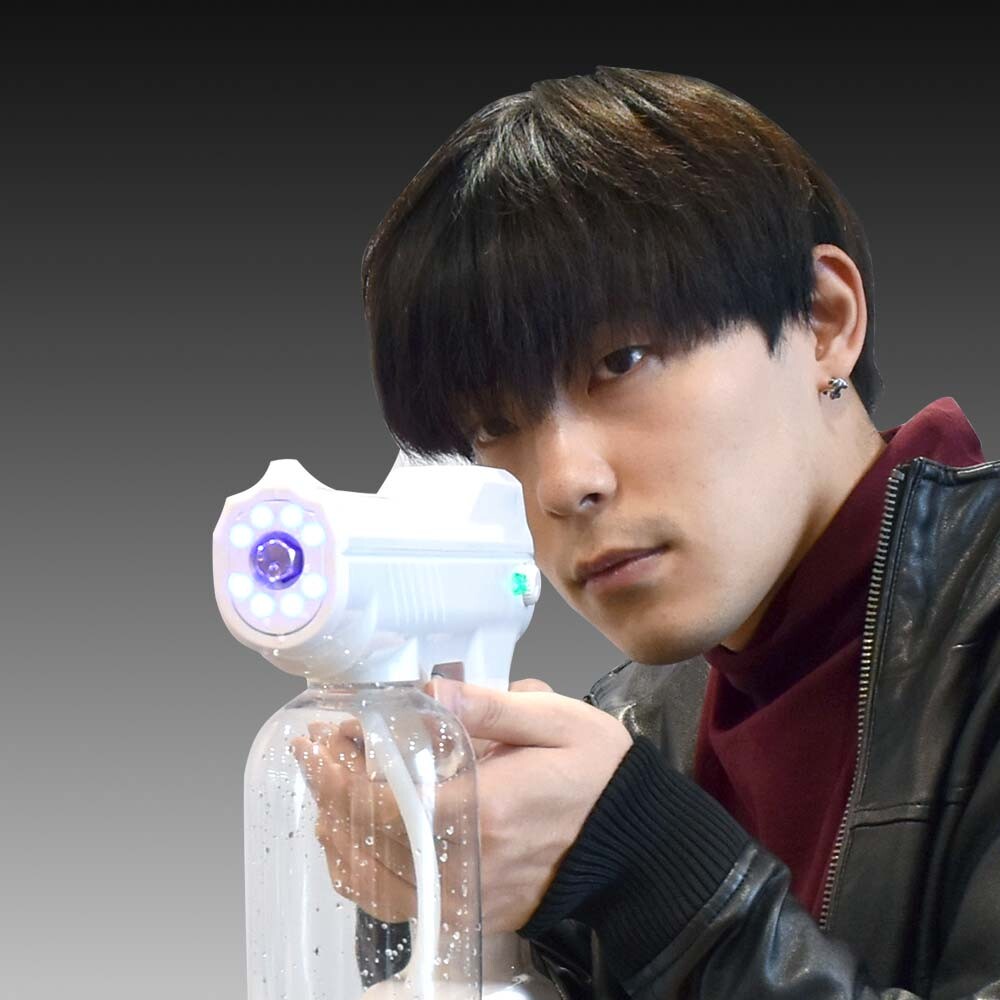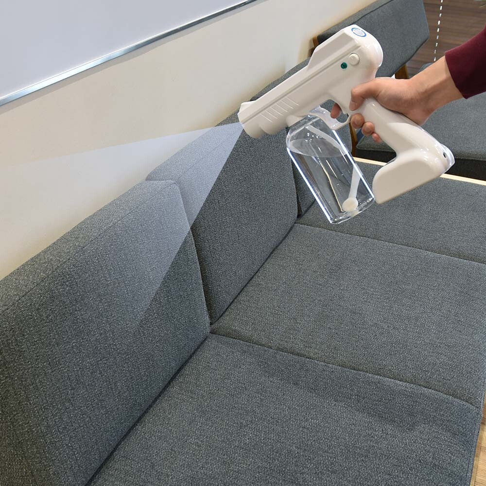能であり、最大1分あたり100ml噴霧できる。2時間の充電で30分稼働。消毒液以外にも水を入れて使うことも可能だ。