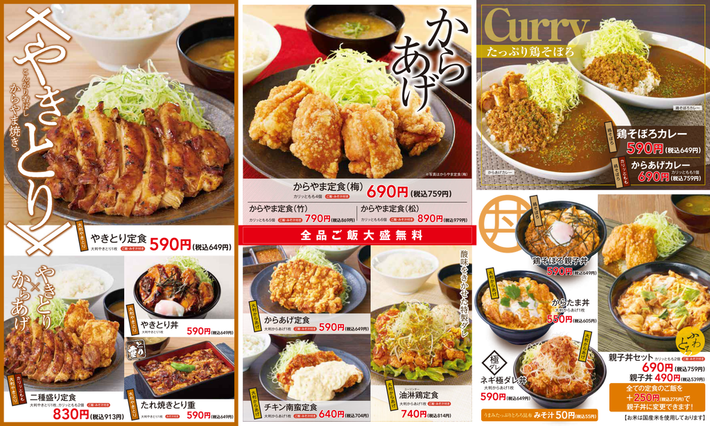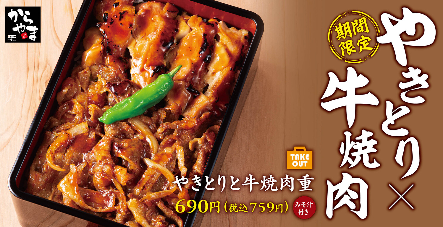 とんかつ専門店「かつや」などを展開するアークランドサービスホールディングス株式会社の子会社、からあげ専門店「からやま」などを運営するエバーアクション株式会社は、国内の「からやま」にて、「やきとりと牛焼肉重」の販売を開始した。