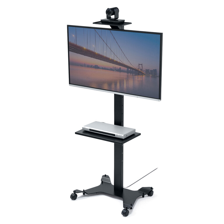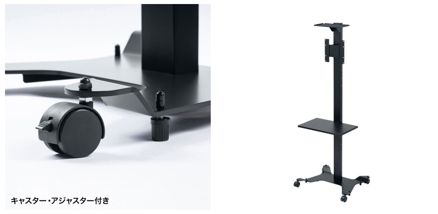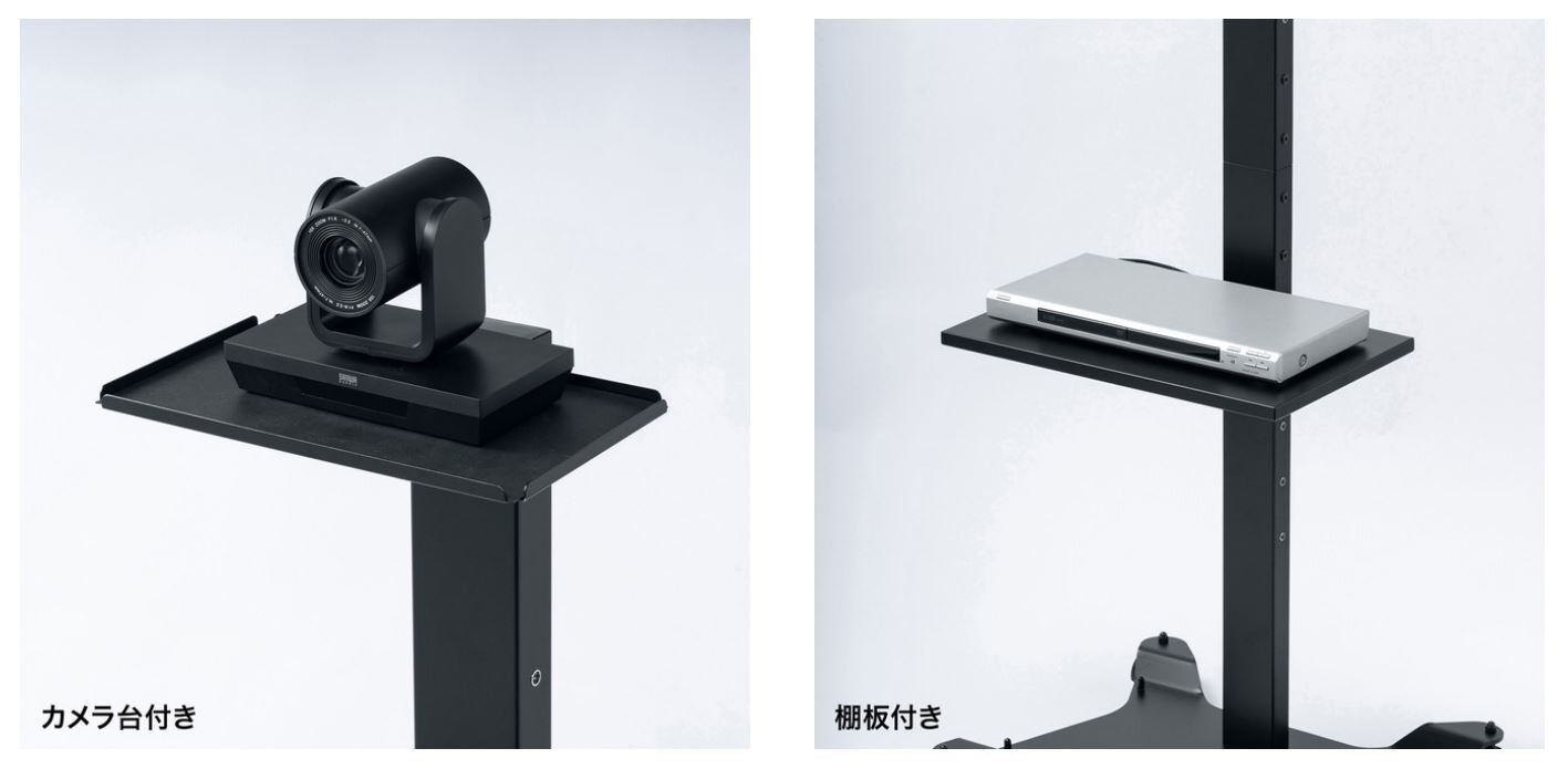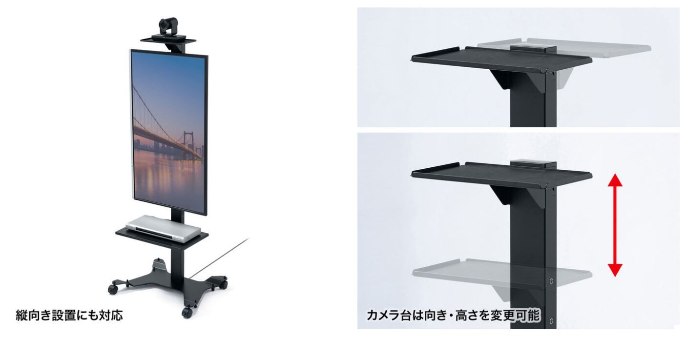 VESA取付け200×200、200×100、100×100mmに対応し、20~42型程度の液晶テレビ・ディスプレイを設置できる。ディスプレイブラケット、棚板、カメラ台は高さ変更可能で、ディスプレイは縦型にも設置可能だ。