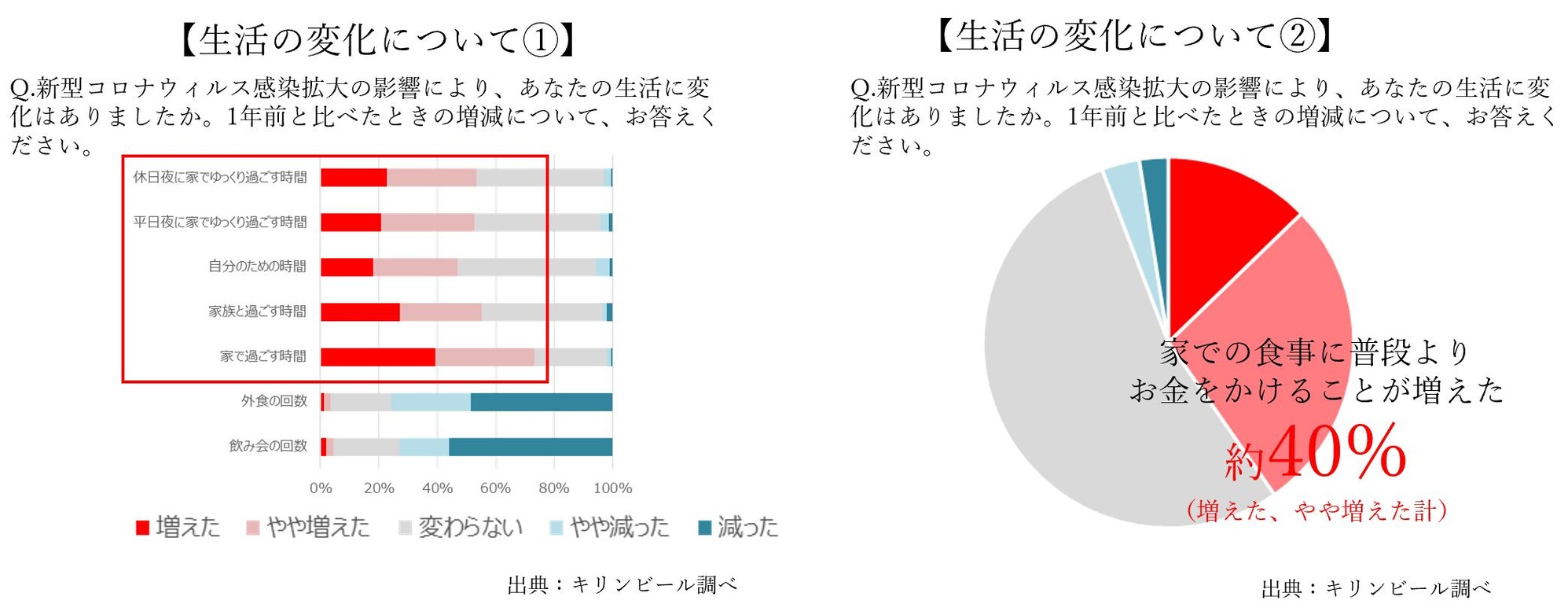 また、約40%が「自宅での食事で普段よりお金をかけることが増えた」という調査結果も出ており、自宅でお金をかけた食事をすることで身近な幸せや、日常の中での特別感を感じたいというインサイトが生まれている。
