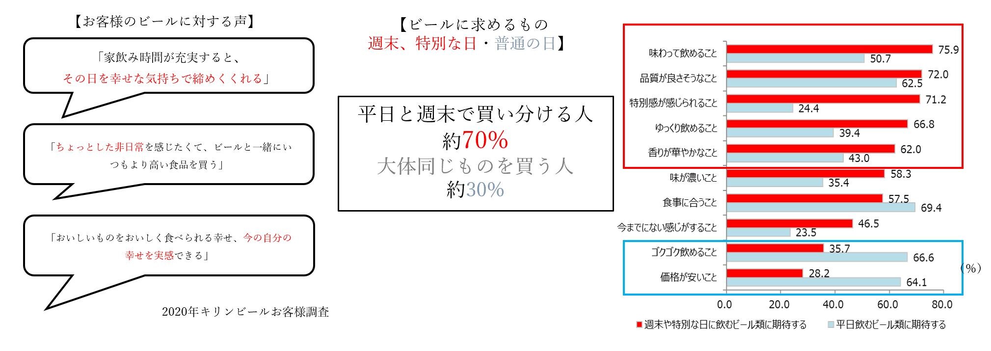 ビール対する生活者の意識も変化している。キリンビールが実施した調査では、家飲みの充実を求めて約70%の人が週末や特別な時(仕事で頑張った日など)には味わって飲める高品質なビール銘柄を選択するという結果に。家飲み時間に、高品質なビールを飲むことで日々を幸せを感じたいというインサイトが高まっている傾向にある。