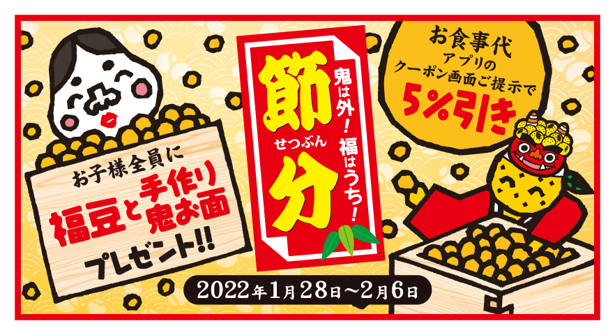 ※「福豆と手作り鬼お面」は、アプリ提示の有無に関わらず、小学生以下のお子さま1名につき1つ、もれなく配布する