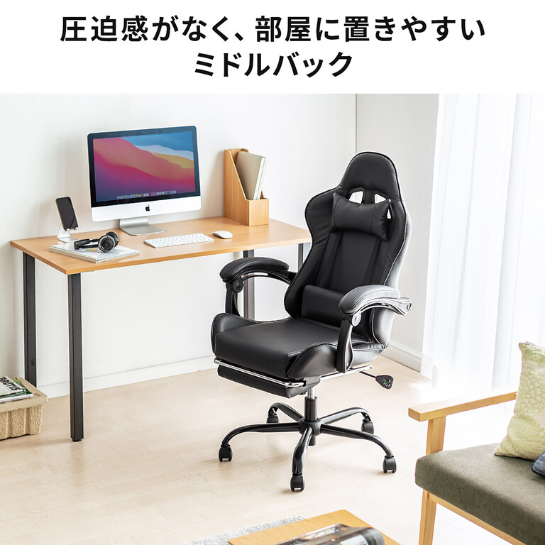 本製品は、圧迫感の少ないミドルバック背もたれのゲーミングチェア。