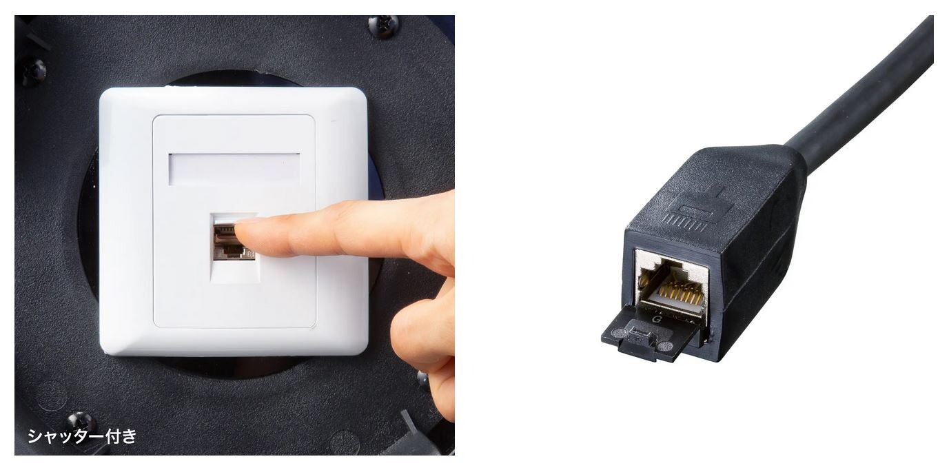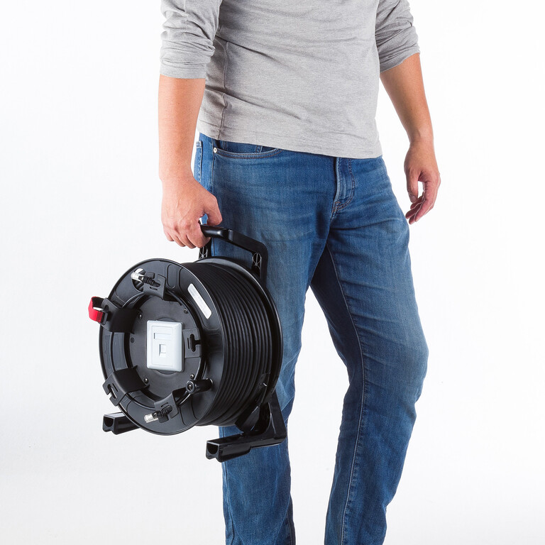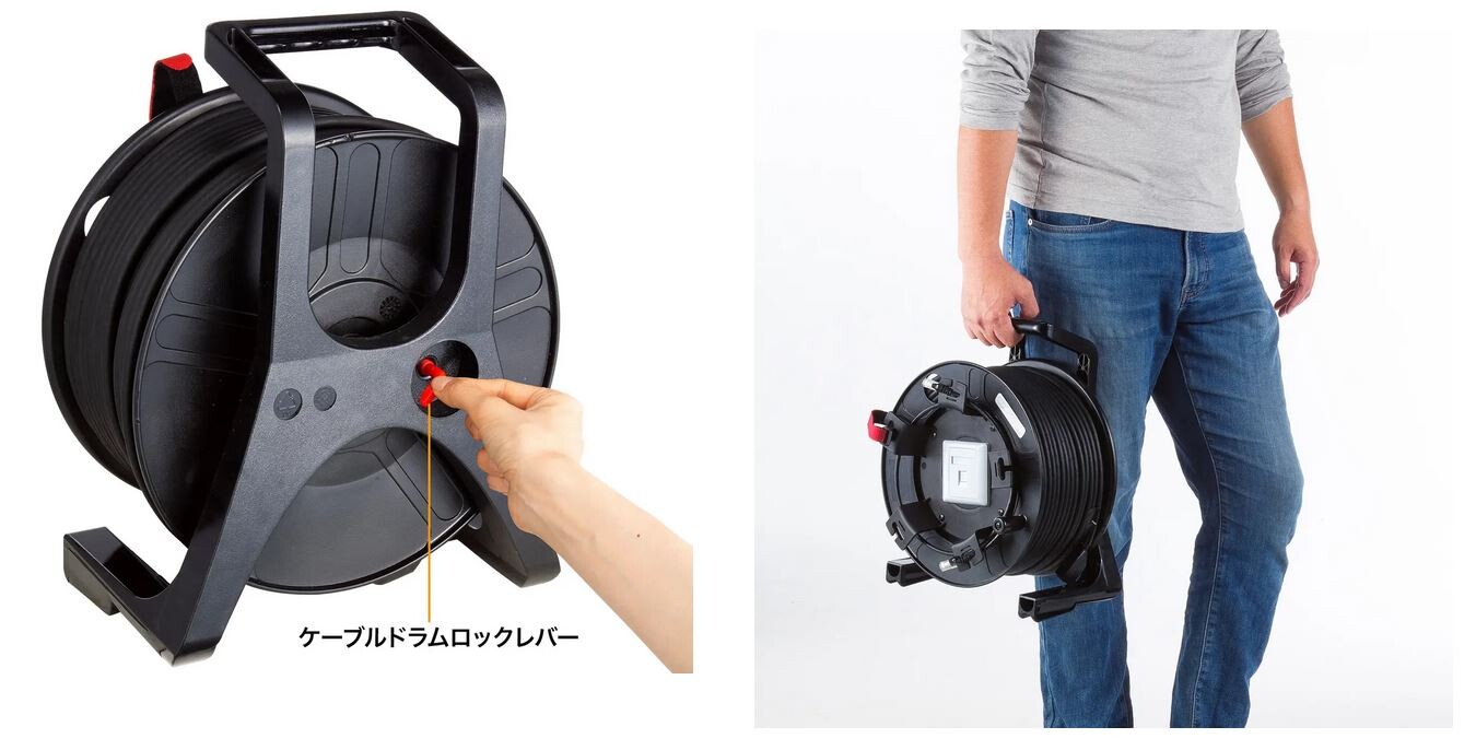 ケーブルリールがスムーズに回転し、会議やイベント時に素早く設置でき、またスピーディーに撤収ができる。PURジャケットケーブルのため、耐水性、耐候性に優れ、屋外での使用にも安心だ。ケーブルの差込口とコネクタにはシャッターが付いており、塵や埃の侵入を防ぐ。