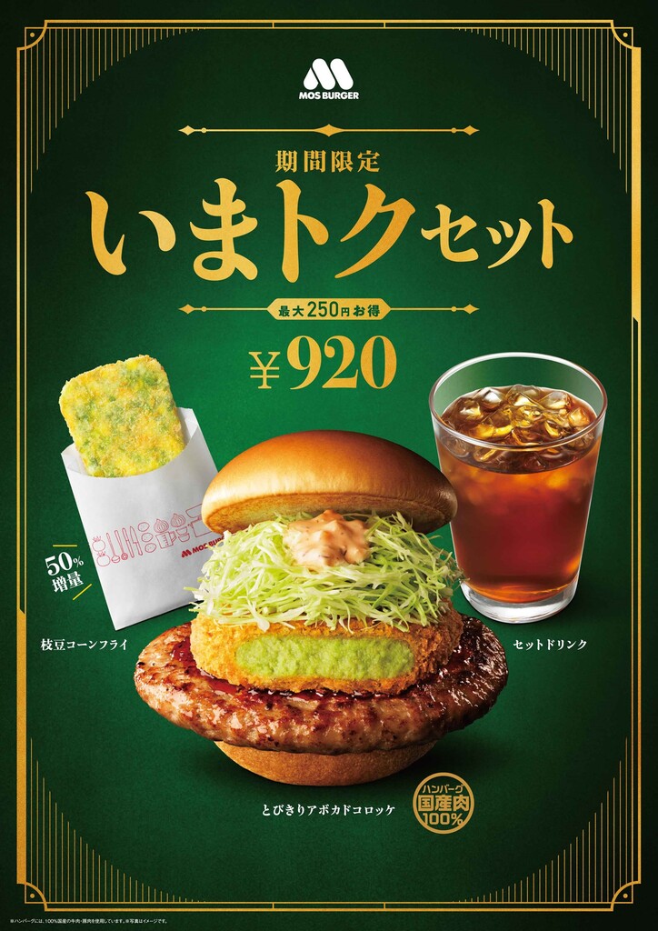 また、「とびきりアボカドコロッケ」に「枝豆コーンフライ」とドリンクをセットにしたお得なメニュー「いまトクセット」も用意している。なお、今回のキャンペーンより「枝豆コーンフライ」をリニューアルし、1.5倍に増量※1た。商品価格はそのままに、ボリュームアップしてさらにお得になったメニューを楽しめる。