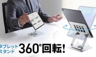 2ヒンジで角度調整も自由自在!台座が360°回転するタブレットスタンド